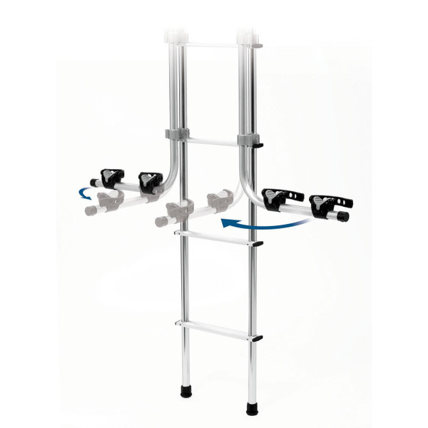 Surco's 501CR ladder mounted folding chair rack mounts easily on the ladder of any Van or RV/Motorhome without the need of straps or removal of ladder. One of a kind pivoting arms allow easy access to use the ladder. Securely carries up to 6 chairs on the padded cradles. Manufactured from heavy gauge aluminum with a bright dipped polished finish. Light weight, easy to handle and fully assembled.