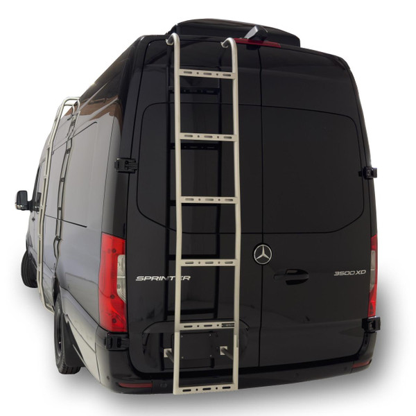 A specialized bracket is installed into the back side of the door to strengthen and support the door and the ladder making sure there is no flexing in the door while climbing or when the ladder is carrying additional gear.